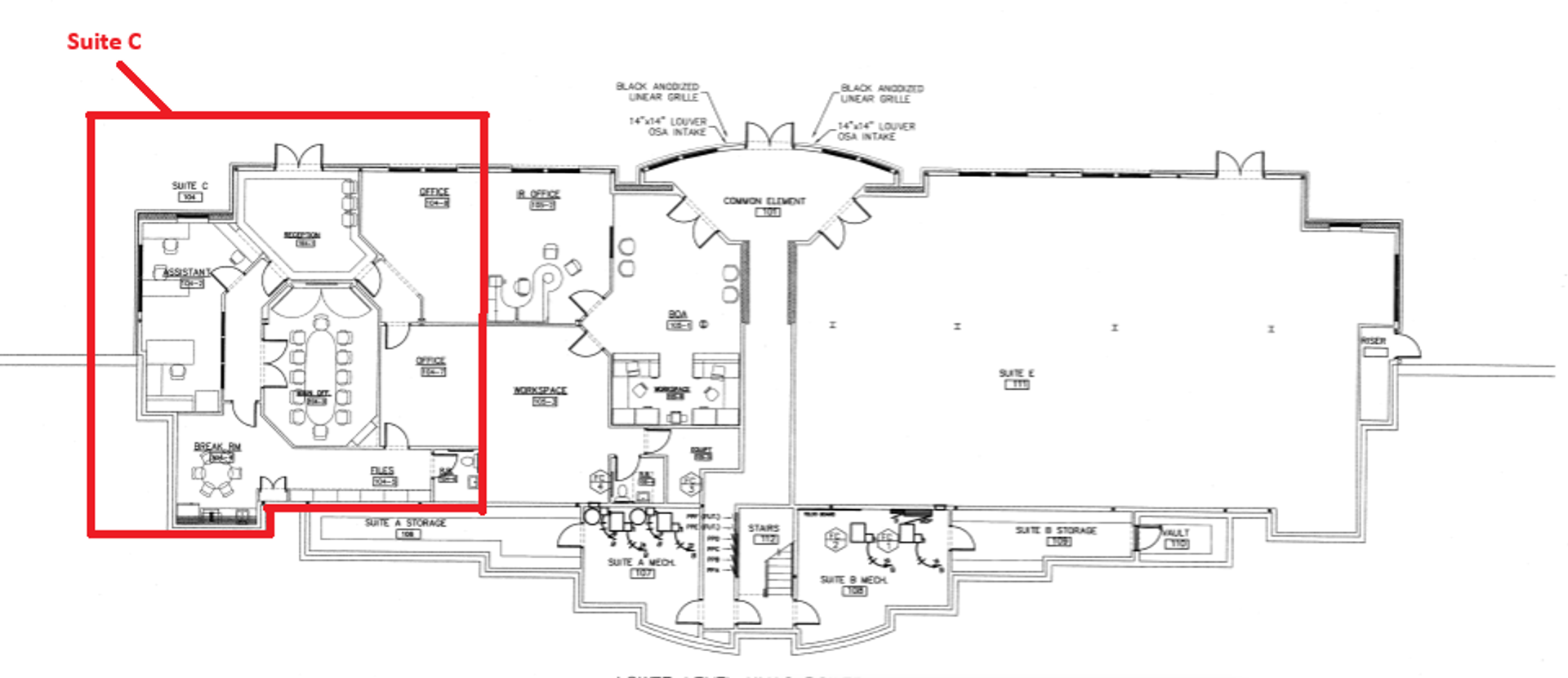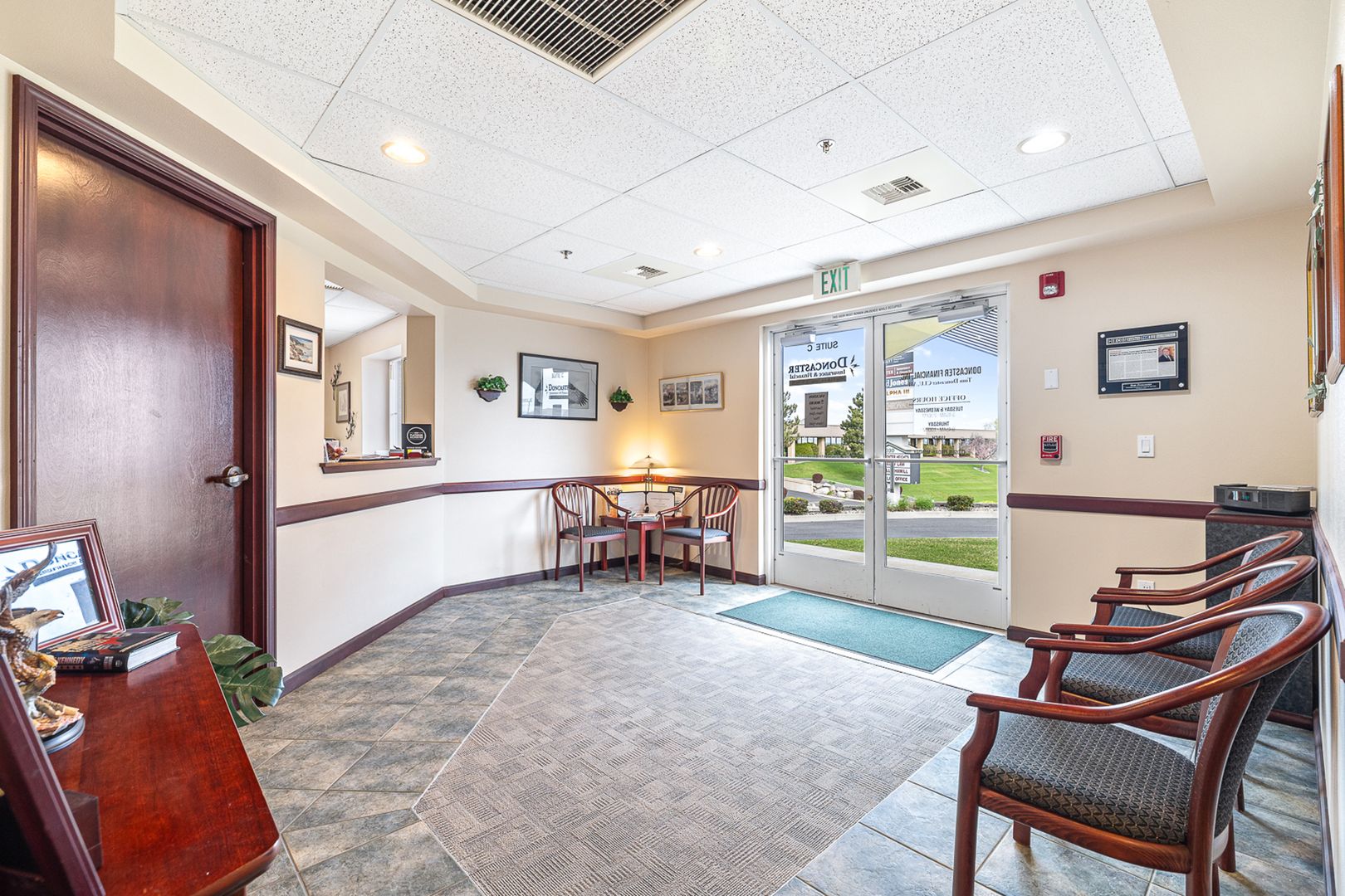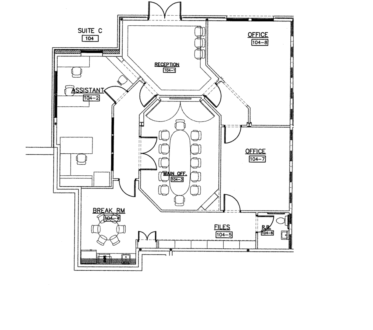 Suite C is a fully equipped space with an efficient layout. Features a break room, conference room, two private offices, dedicated file storage area, reception, waiting room, and private restroom. Electricity is included in NNN charges. Tenant is responsible for their own phone service, shredding services, and office cleaning. Office furnishings may be included or removed upon request.