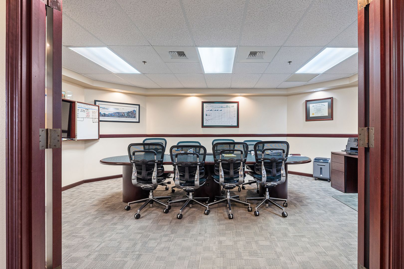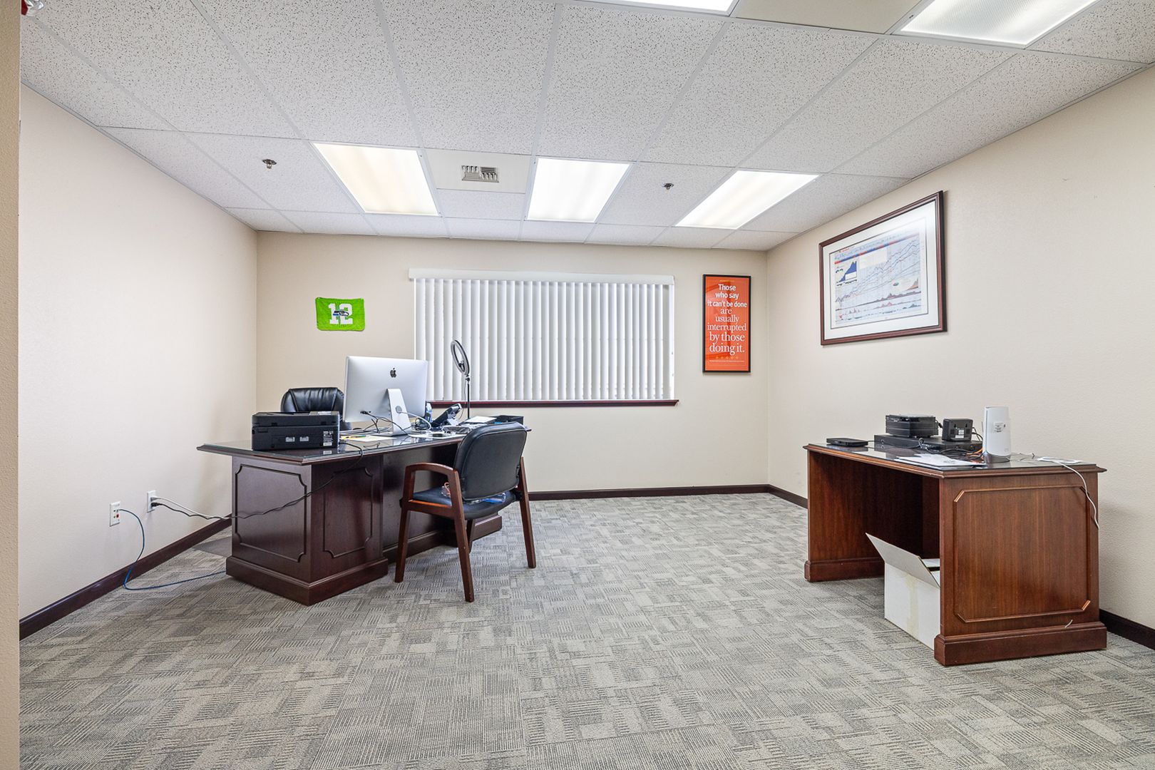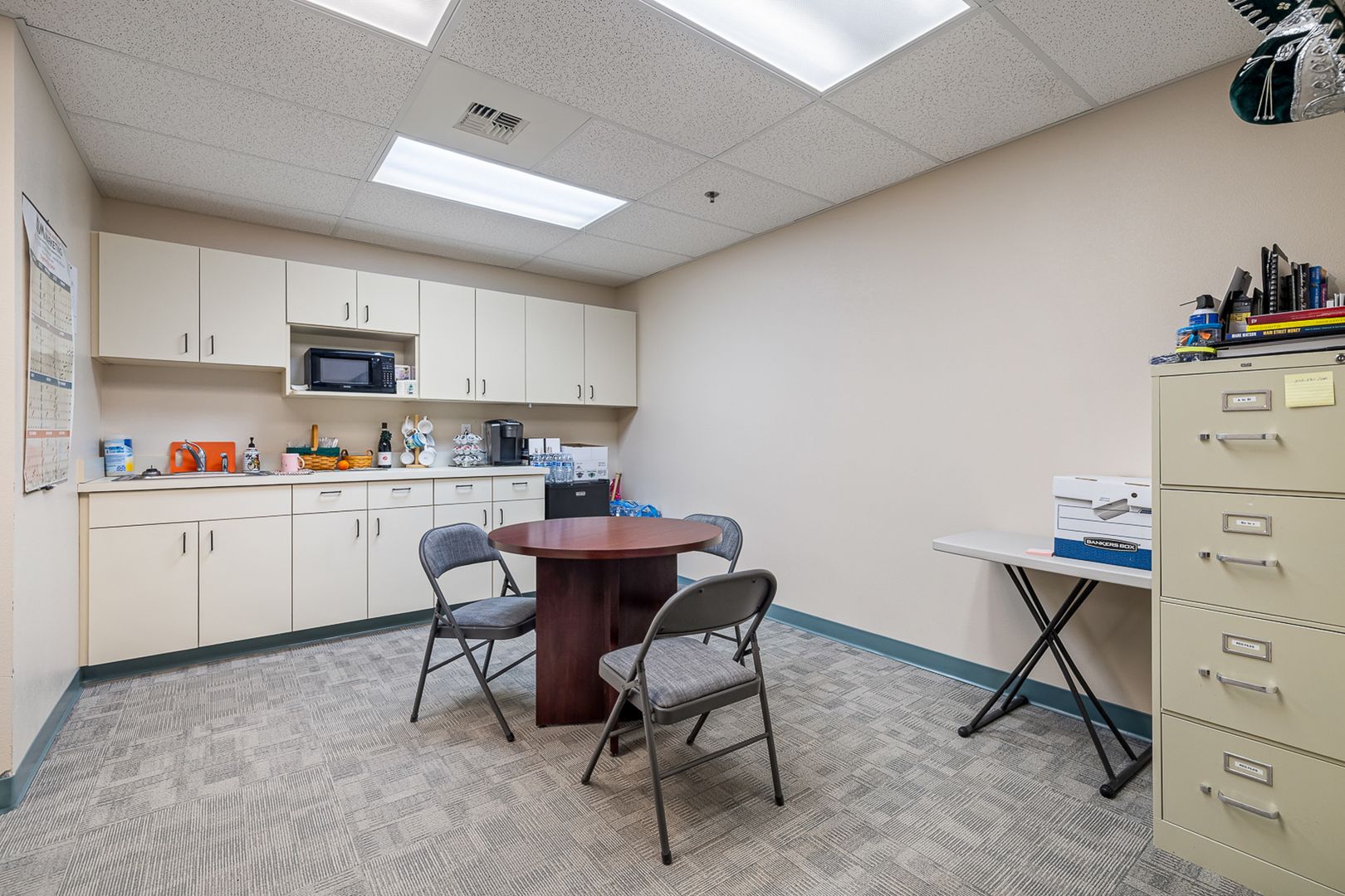 Suite C is a fully equipped space with an efficient layout. Features a break room, conference room, two private offices, dedicated file storage area, reception, waiting room, and private restroom. Electricity is included in NNN charges. Tenant is responsible for their own phone service, shredding services, and office cleaning. Office furnishings may be included or removed upon request.