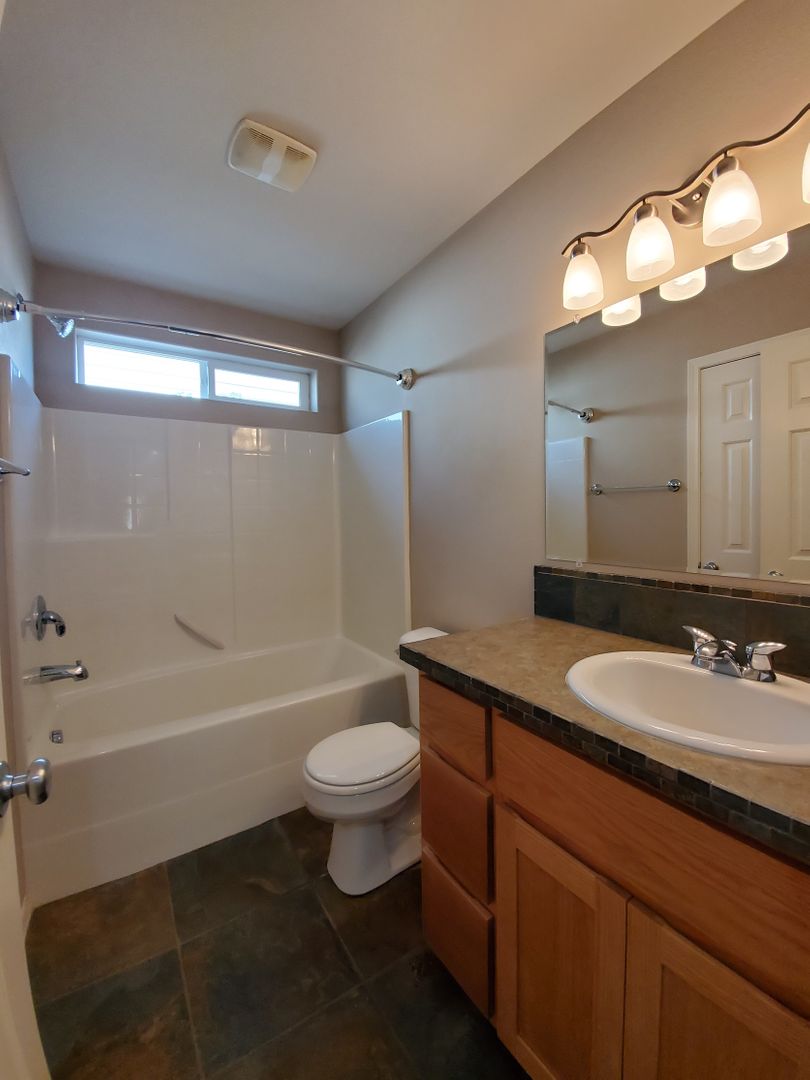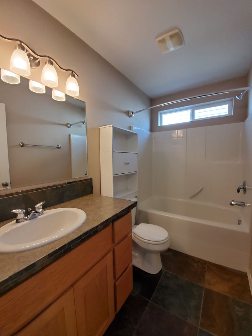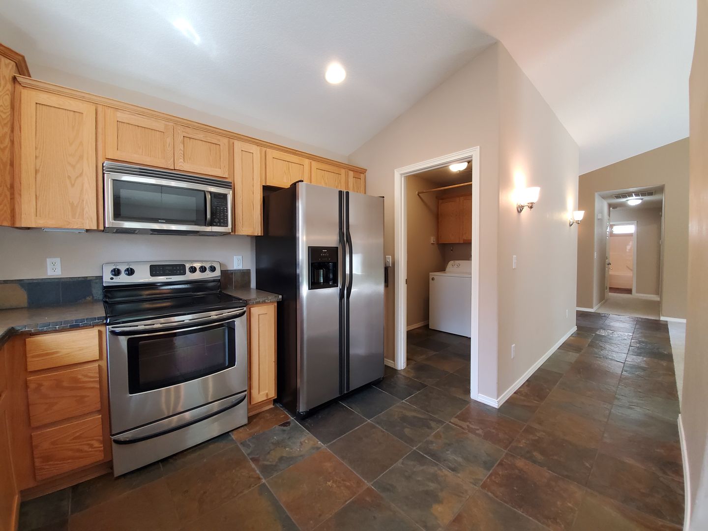 Stainless appliances in this lovely kitchen blend well with the counter tile trim and slate floors. Plenty of storage in the large pantry plus washer and dryer included. Custom paint throughout, both bathrooms have slate floors, lots of windows and light, great landscaping front and back with large patio in the fenced back yard.