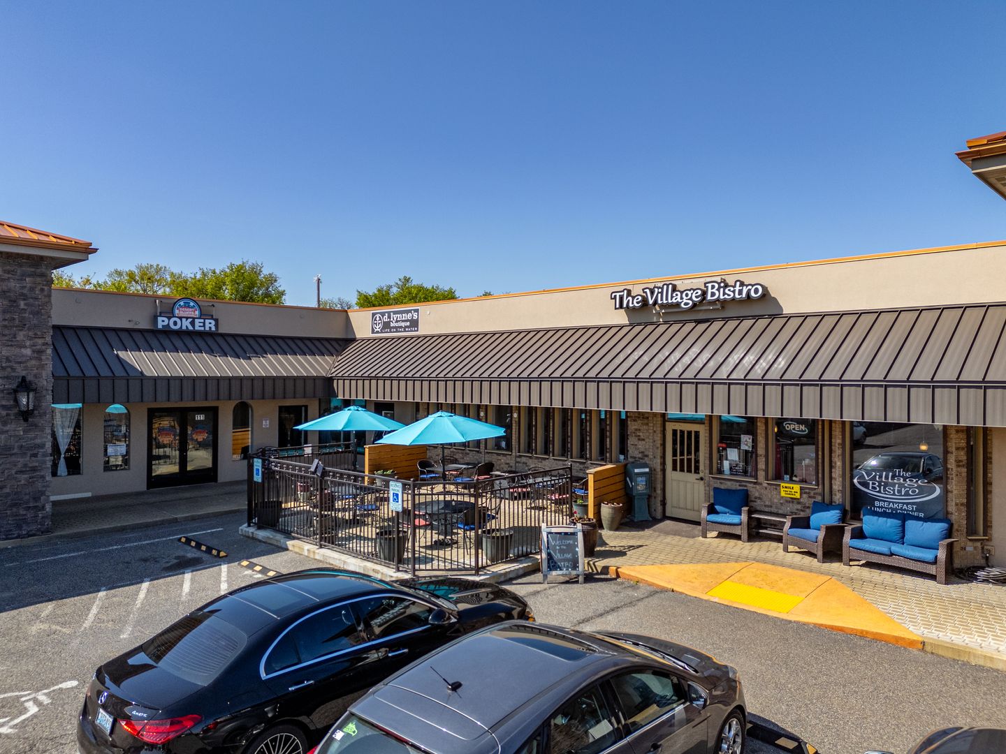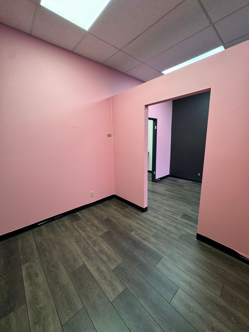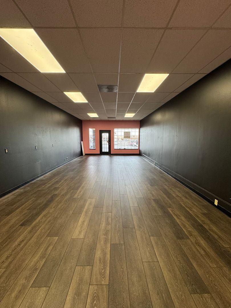 Suite 108 offers approximately 1,020± square feet of versatile space featuring an open floor plan well-suited for a variety of retail or service uses. The suite includes a private office, private restroom, shop sink, hardwood flooring throughout, and a glass-front entry that provides excellent visibility and natural light.