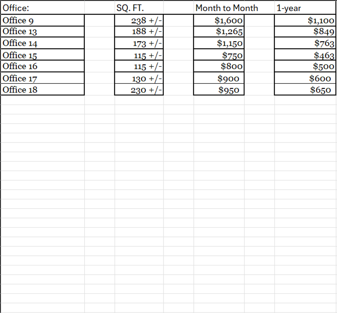 Each individual office varies on pricing, the advertised office is the smallest space and the price is for a 1-year lease agreement. Please see the attached floor plan for the current offices that are available and contact LA for more details on pricing.